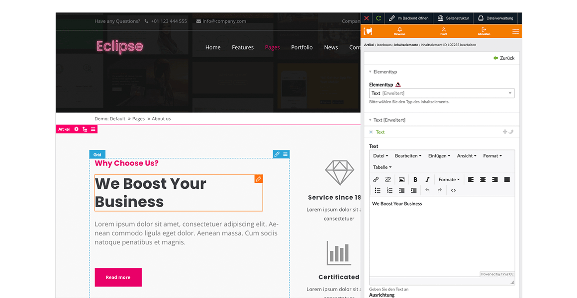 Edit content directly in the frontend. Work faster than ever with Contao.